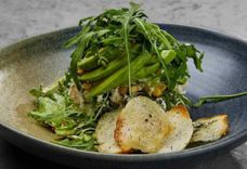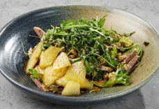 170 г • Микс салата, язык отварной, груша, мед, масло сливочное, кунжут, кедровый орех, руккола, бальзамический соус, ореховый соус, соевый соус, сок лимона