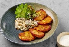 195 г • Баклажан, крахмал, томат черри, соус сладкий чили, соус терияки, петрушка, кунжут