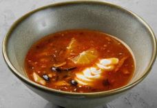 300/82 г • Бульон рыбный, кокосовое молоко, имбирь свежий, перец чили, лимон, шампиньоны, креветки, мидии в ракушках, томаты черри, кинза, рис, лайм, кунжут