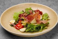 208 г • Пармская ветчина,груша, перепелиное яйцо,томат черри, тыквенные семечки, медово-горчичная заправка, салатный микс,микрогрин