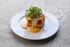 250 г • Бриошь, глазунья, бекон, сырный соус, сыр выдержанный твердый