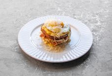 280 г • Яйцо куриное, молоко, соус фета, мортаделла, сыр выдержанный твердый, микрозелень, зеленое масло