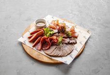 390 г • Ростбиф из говядины, колбаски копченые, полендвица, язык отварной, колбаса с/к, соус хрен