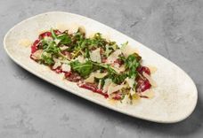 120 г • Вырезка говяжья, соус из тунца, бальзамическая заправка, сыр выдержанный твердый, каперсы, руккола