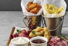 645 г • Копченые колбаски, гриссини, колбаса с/к, куриные наггетсы, картофель фри, язык говяжий, микрогрин, соус тартар, соус барбекю