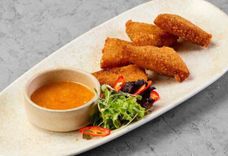 210 г • Сыр моцарелла, мука, яйцо куриное, сухари панировочные, соус цитрусовый, перец чили, микс салата