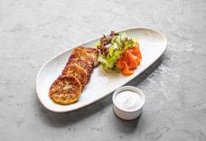 165/100/50/2 г • Драники, лосось с/с, мягкий сыр, огурцы, микс салата, перечная смесь
