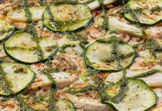 310 г • Куриное филе, шампиньоны, цукини, сыр моцарелла, соус песто, соус-пицца, приправа гирос