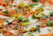 320 г • Филе куриное, бекон, лук-порей, томат свежий, соус-пицца, сыр моцарелла, заправка медово-горчичная, петрушка