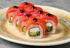 255 г • рис, нори, лосось, тунец, авокадо, огурец, сыр кремчиз, икра тобико, устричный соус