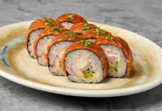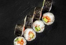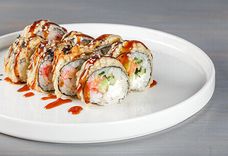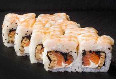 250 г • рис, нори, сыр кремчиз, огурец, авокадо, семга, креветки, имбирь маринованный, кляр, соус терияки,кунжут