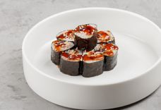 250 г • Тунец св/м, креветки, такуан, сыр кремчиз, соус спайси майонезный, водоросли нори, рис